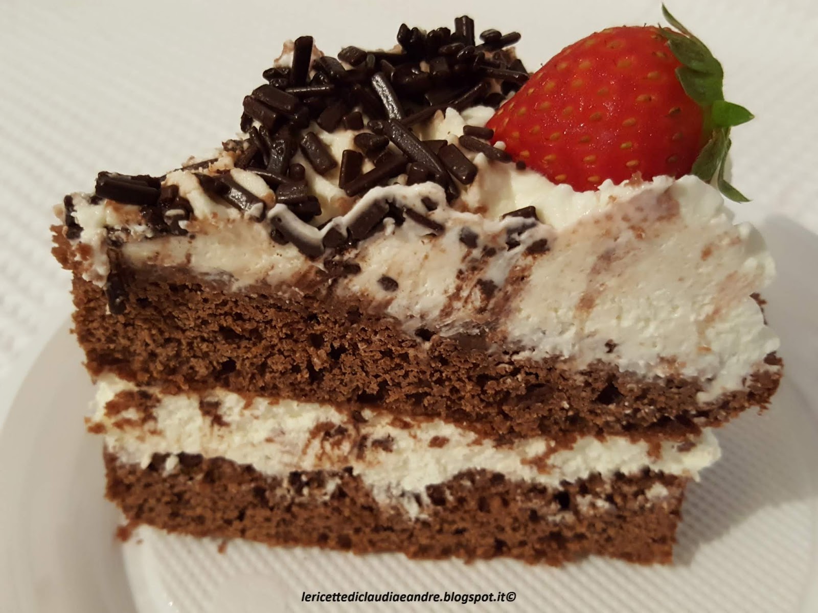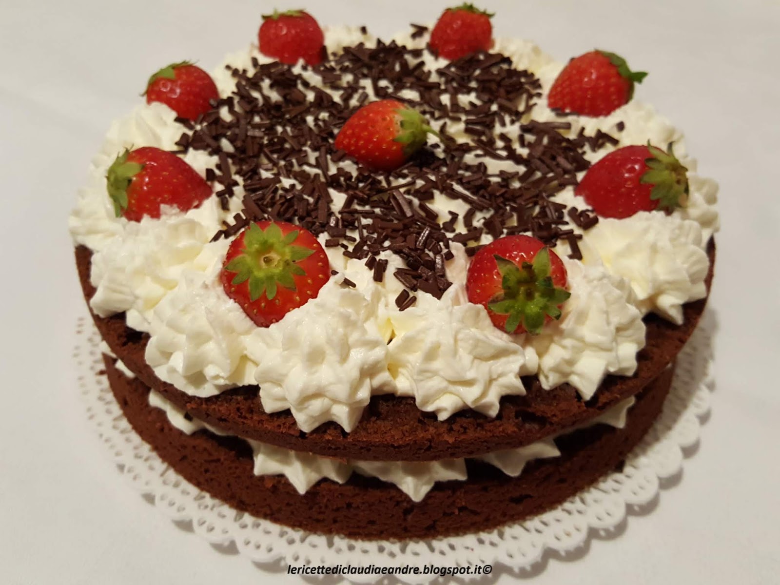 - Coprire con l’altra base e decorare a piacere con altra crema, fragole e scaglie o codette di cioccolato.