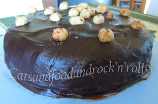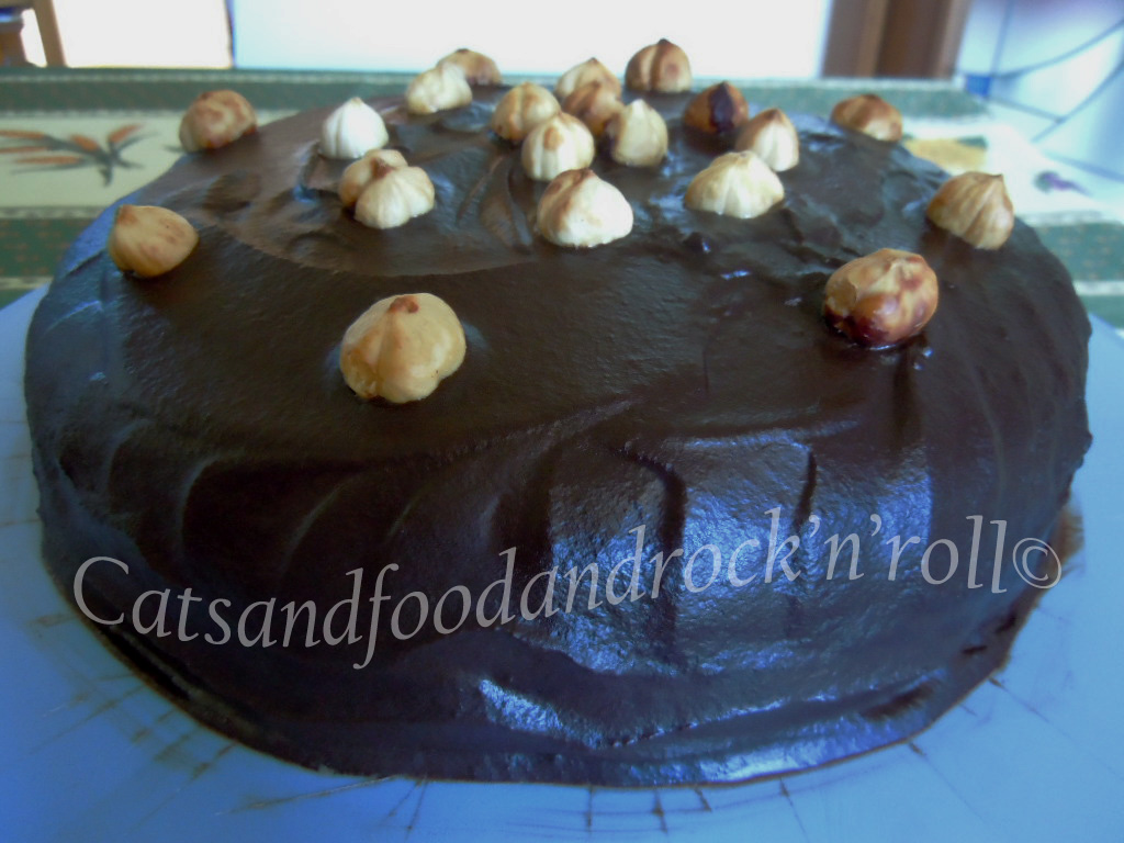 Coprire uniformemente la torta con questa ganache e decorare con le nocciole intere tostate.