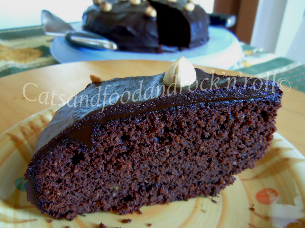 Questa torta è una tentazione dark, una goduriosa peccaminosa realizzazione al doppio cioccolato con l’impiego prevalente di farina di nocciole, e nocciole tostate intere (mi raccomando, Giffoni IGP se potete!) per una sobria e golosa decorazione, delicatamente profumata d’arancia che, si sa, col cioccolato fondente ci va a nozze.