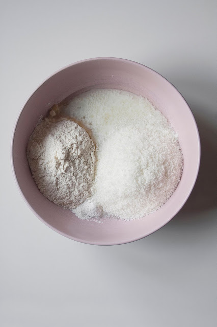 In una ciotola capiente versate lo zucchero semolato e l’olio di cocco e mescolate per bene con le fruste elettriche. Poi unite la farina 00 setacciata con il lievito in polvere, il cocco rapè e gradualmente anche il latte di cocco.