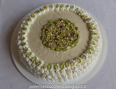 Tagliare il Pan di Spagna a metà e inumidirlo con la bagna. Distribuire sul primo disco una dose di crema da ottenere uno strato di un cm e livellarla. Ricoprire con il secondo disco di Pan di Spagna e coprire anche questo con la crema al pistacchio. Guarnire la circonferenza con la panna rimasta poi decorare a piacere con dei pistacchi.