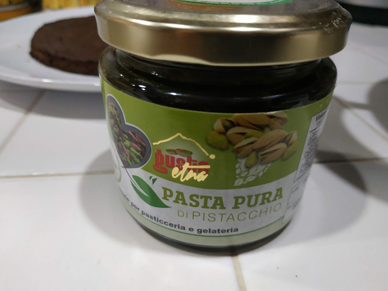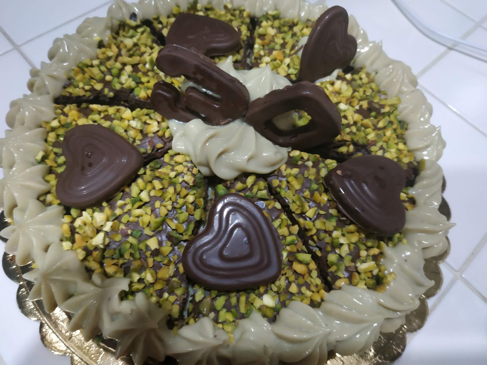 Versate il cioccolato rimanente su un disco di biscuit e fate rapprendere dopo aver completato con una bella manciata di granella di pistacchio di Bronte.