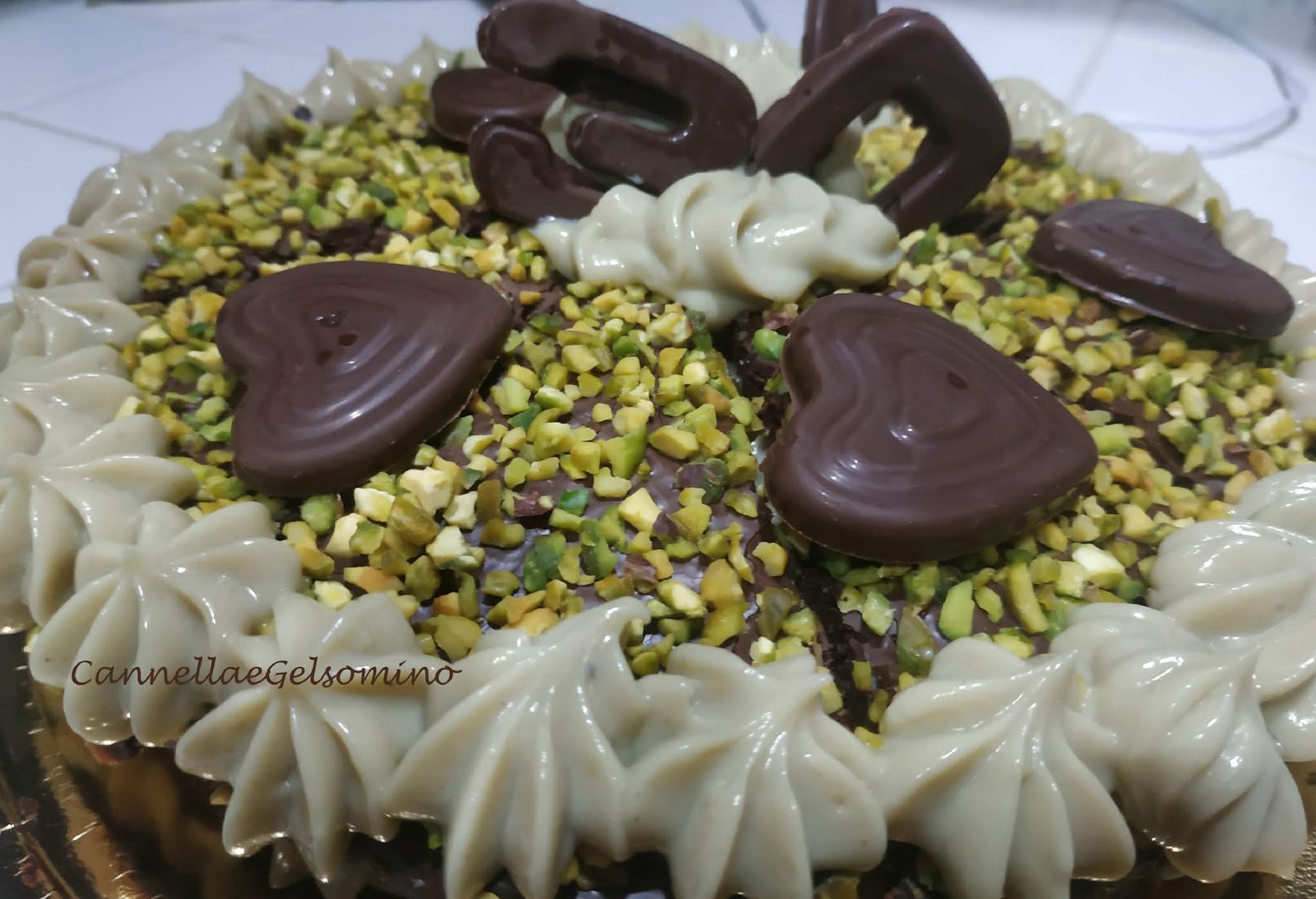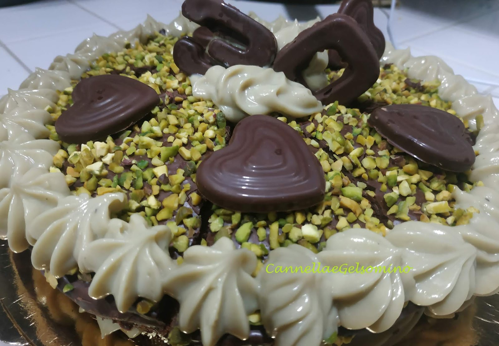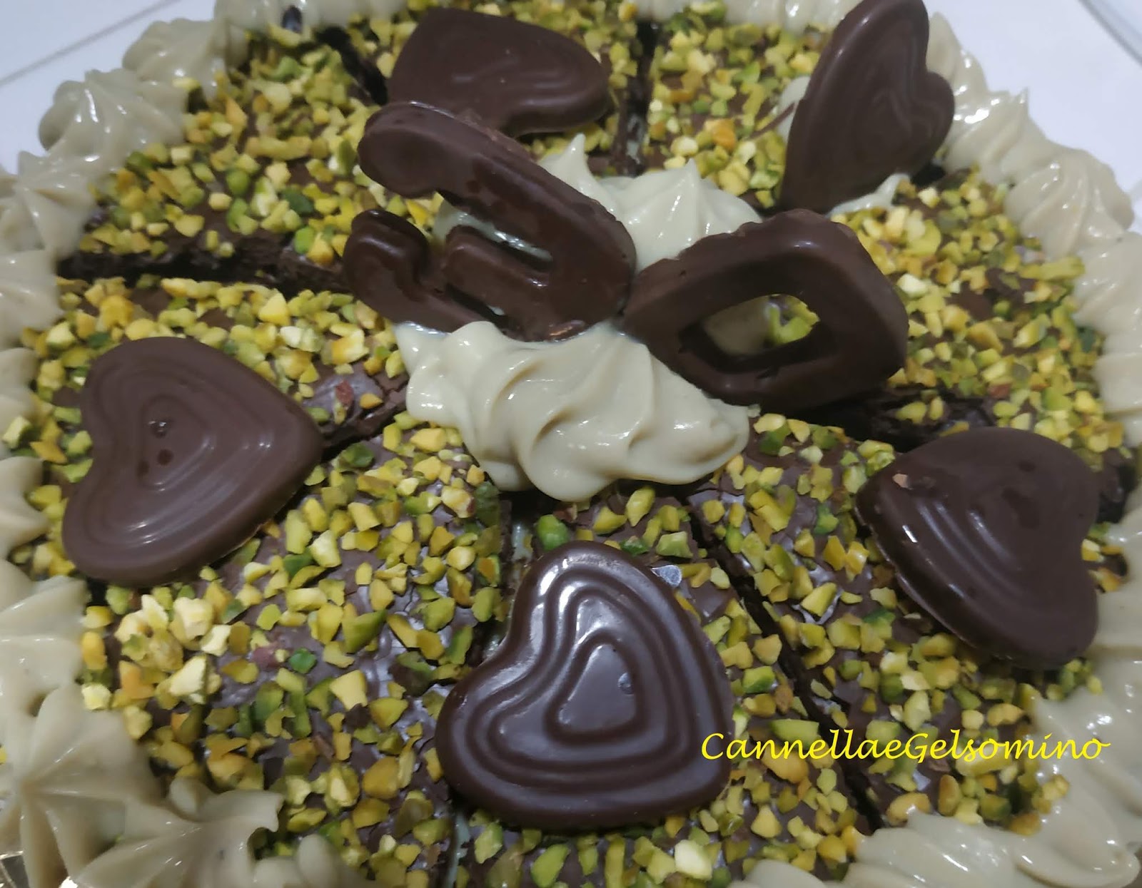 Questa torta è nata per il compleanno di mio figlio, ma ritengo possa essere perfetta anche per la festa di Pasqua o addirittura come dolce in cui riutilizzare il cioccolato che sicuramente vi avanzerà. Quindi fate un po’ voi: il dolce ha varie consistenze, sofficità del biscuit, morbidezza della crema, croccantezza dello strato superiore dove il cioccolato fondente incontra la granella di pistacchio di Bronte. E’ un po’ una torta alla rovescia, perchè solitamente lo strato più duro viene messo alla base, ma dato che doveva assomigliare al festeggiato, ho voluto di proposito farla fuori dagli schemi.