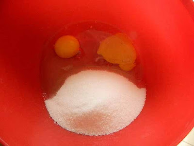 In un’ampia ciotola montare le uova con lo zucchero,