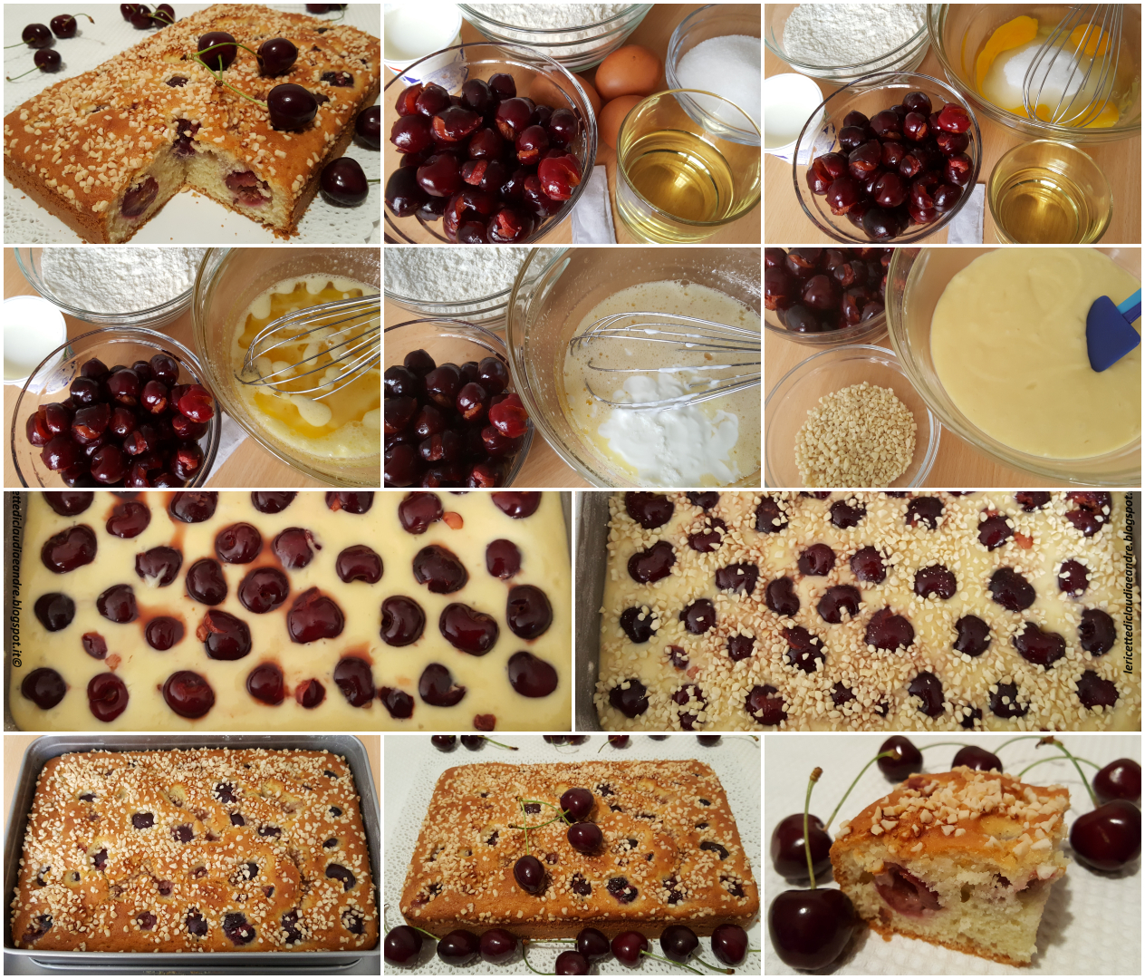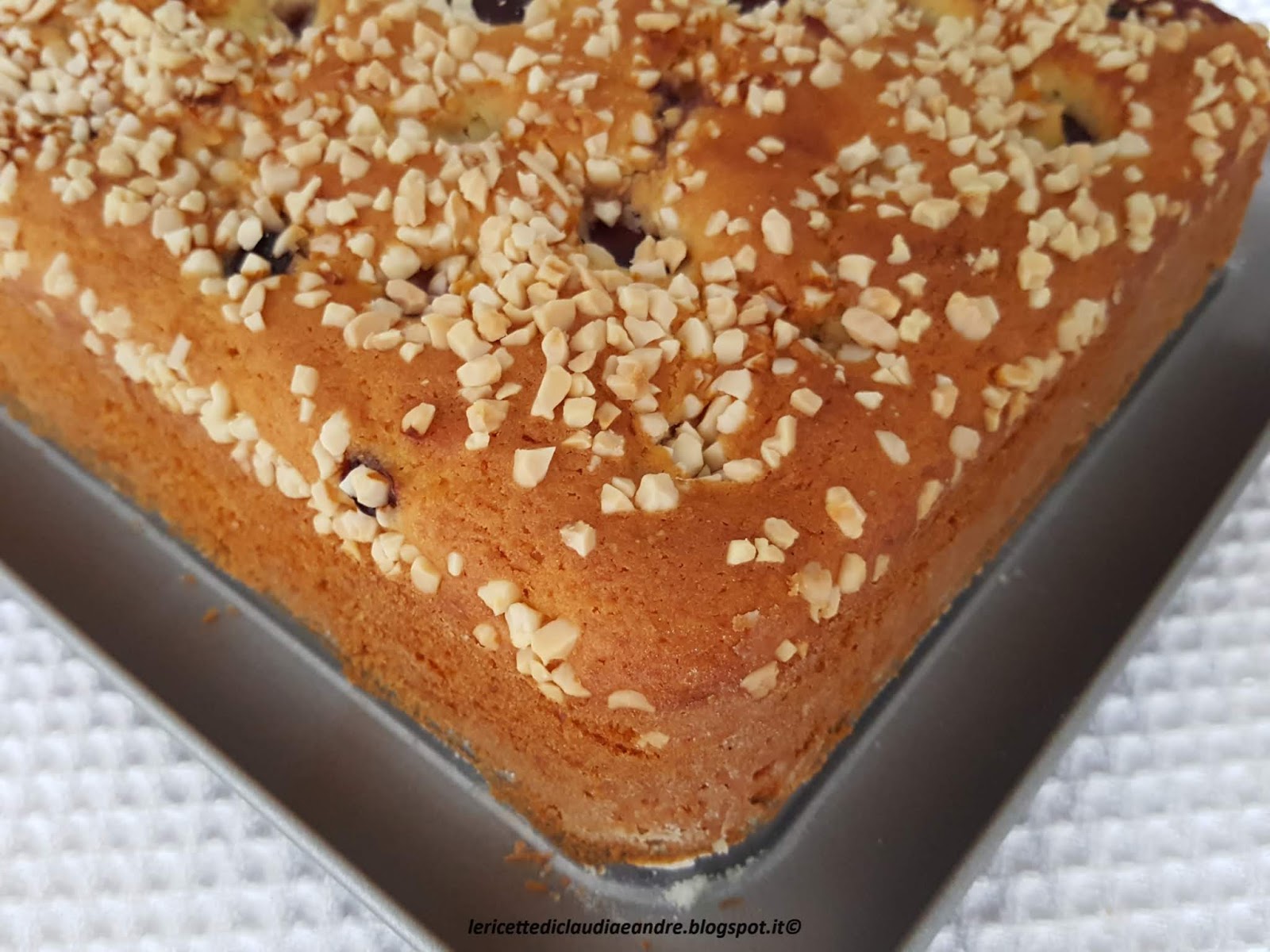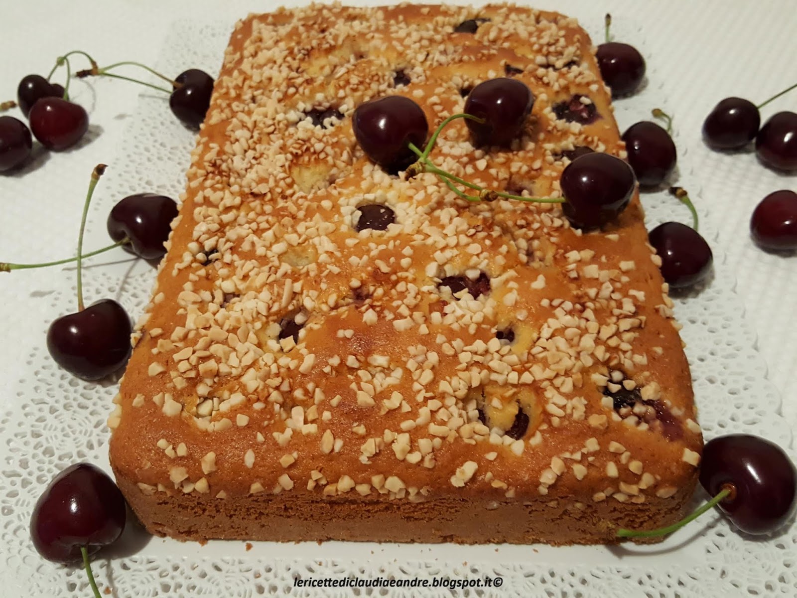 - Imburrare ed infarinare una teglia rettangolare da 27 x 17,5 cm , distribuire sopra le ciliegie, la granella di mandorla e cuocere nel forno preriscaldato a 180° per circa 45-50 minuti circa facendo la prova stecchino perché dipende molto da forno a forno.