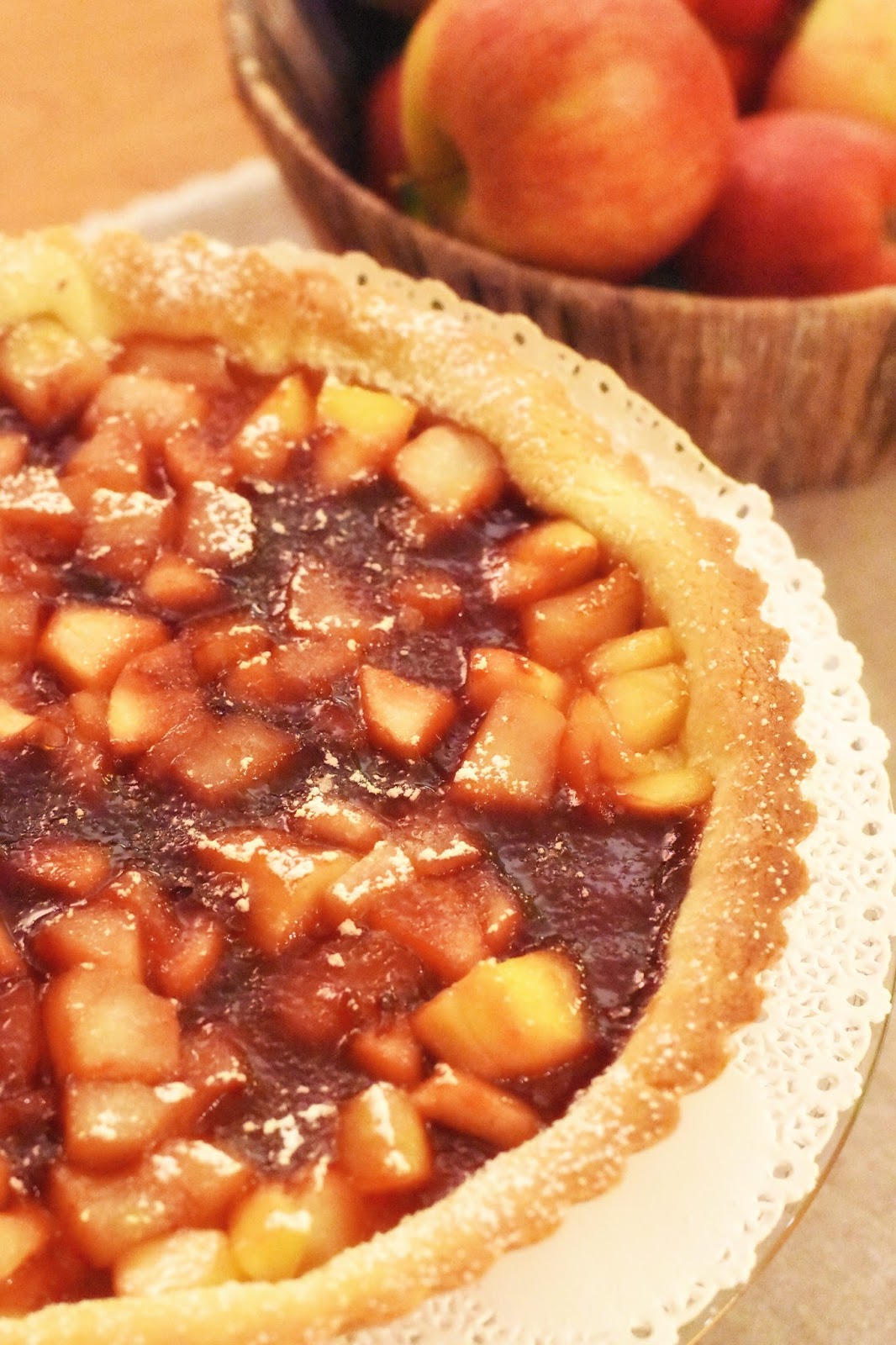 Per la base abbiamo una frolla alle mandorle; per il ripieno abbiamo delle pere e delle mele al rum, profumate con la cannella; per completare la farcitura e per legare abbiamo invece della confettura di ciliegie fatta in casa.