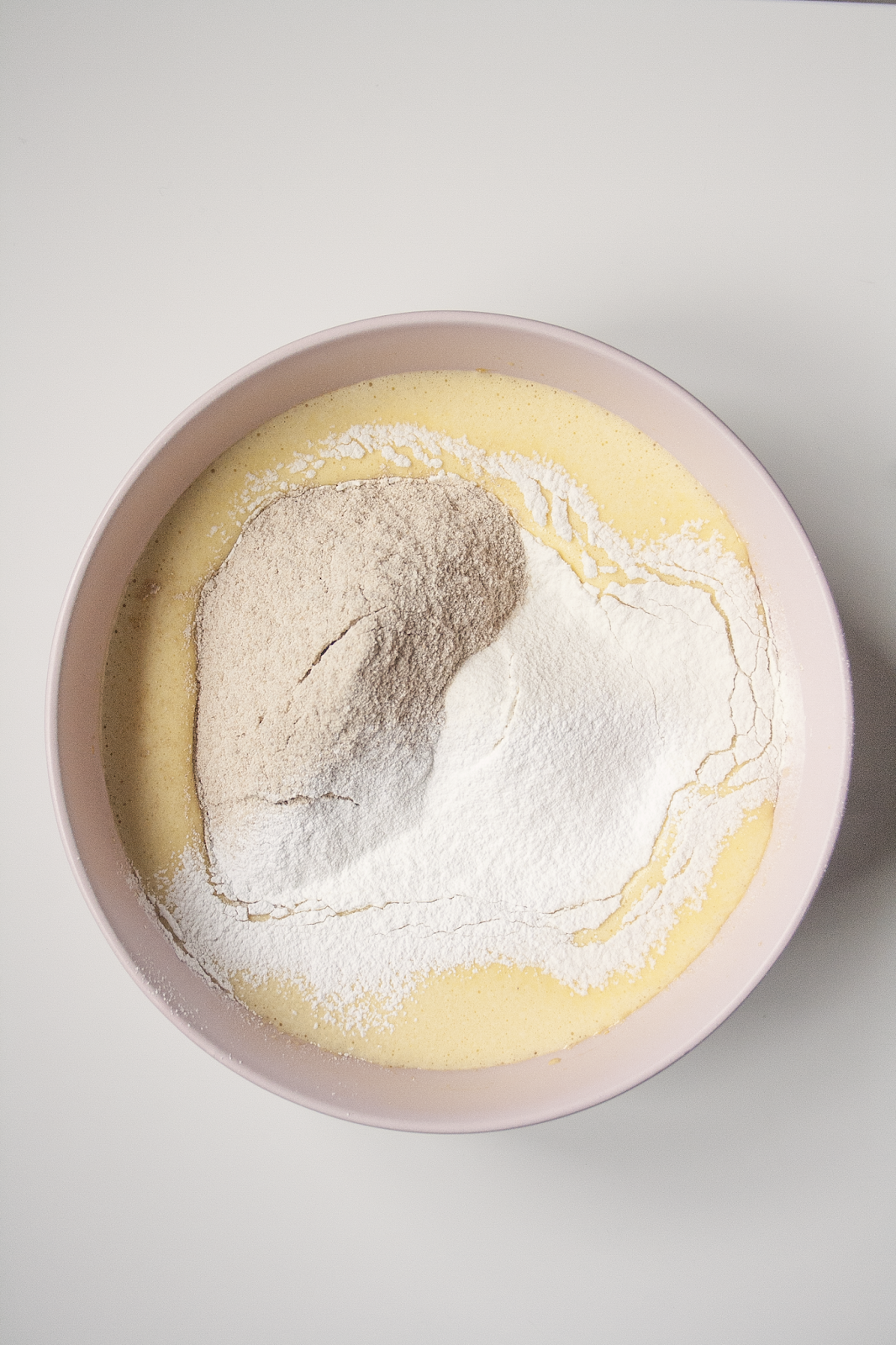 Adoperando le fruste elettriche, amalgamate per bene gli ingredienti tra di loro, dopodiché incorporate lo yogurt bianco, l’olio di semi di girasole e infine le farine setacciate con il lievito in polvere.