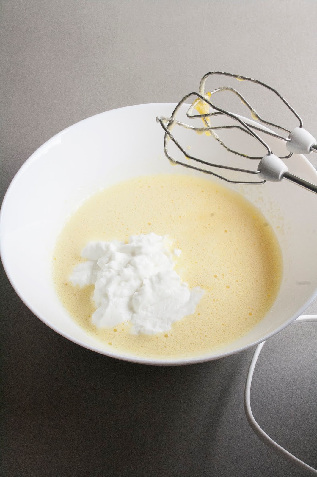 Unite le 3 uova intere, lo yogurt e l’estratto di vaniglia e mescolate per bene fino ad ottenere un impasto liscio e omogeneo.