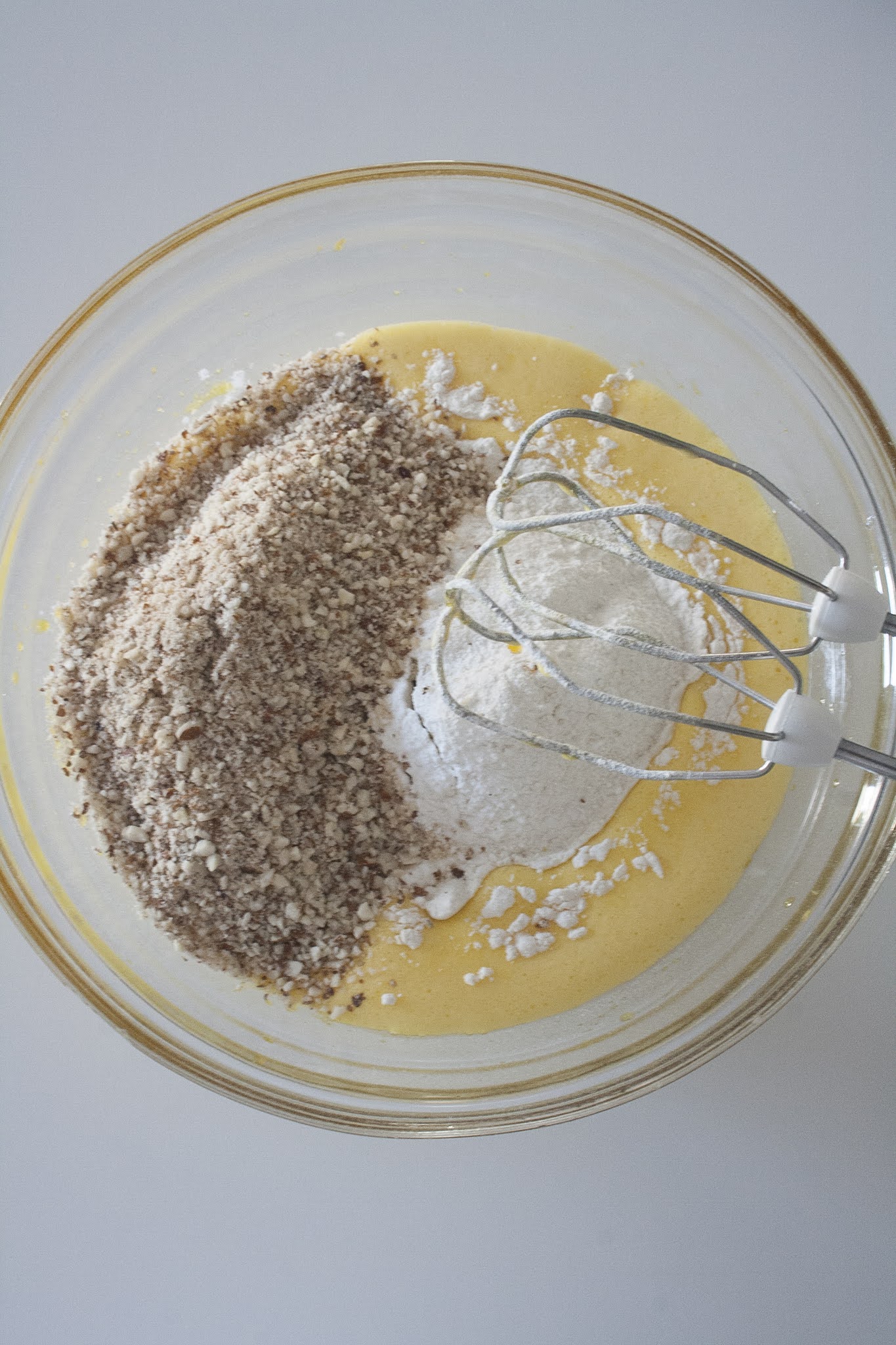 Poi aggiungete l’olio d’oliva e 2 cucchiai di acqua, mescolate e poi unite gradualmente anche la farina 00 setacciata con la vanillina e il lievito e infine la farina di mandorle.