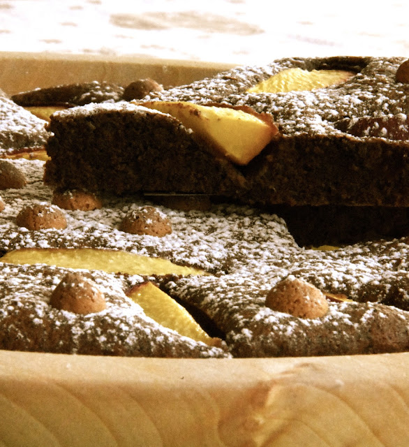 - Coliamo il composto ottenuto in uno stampo da forno e aggiungiamo le fette di pesca fresca e gli amaretti in maniera armoniosa e piacevole.
