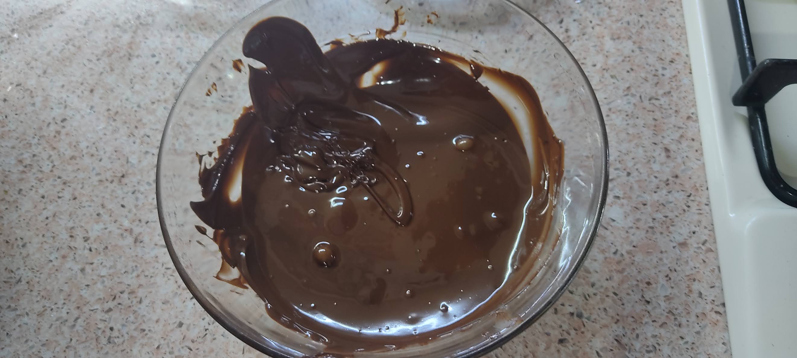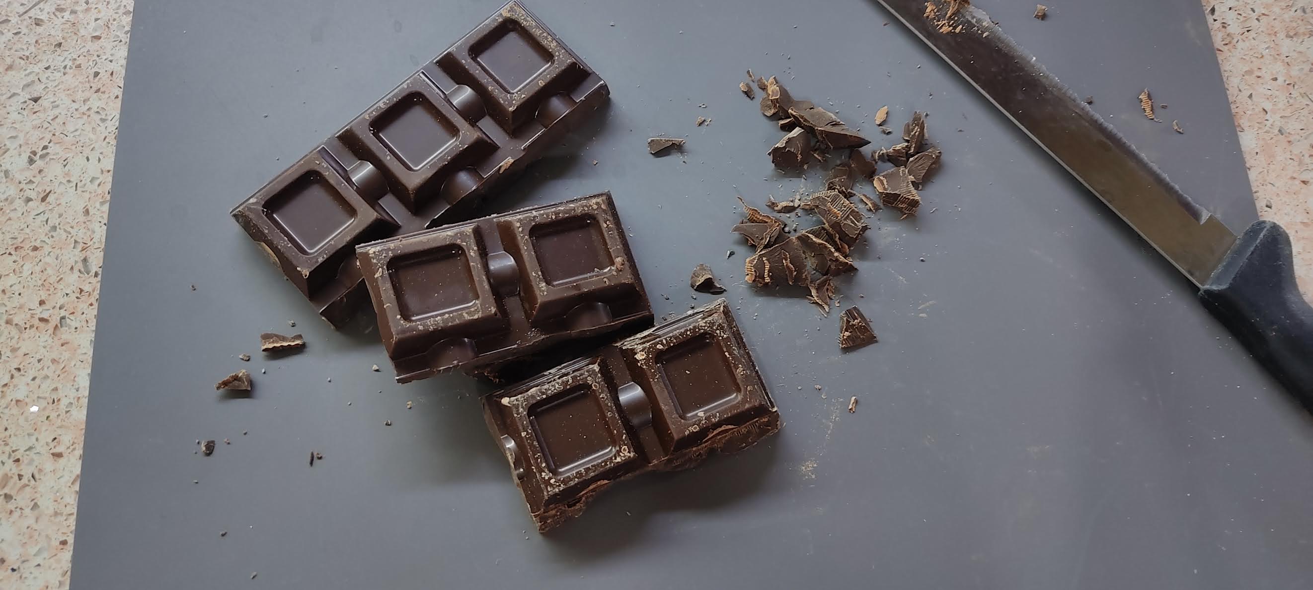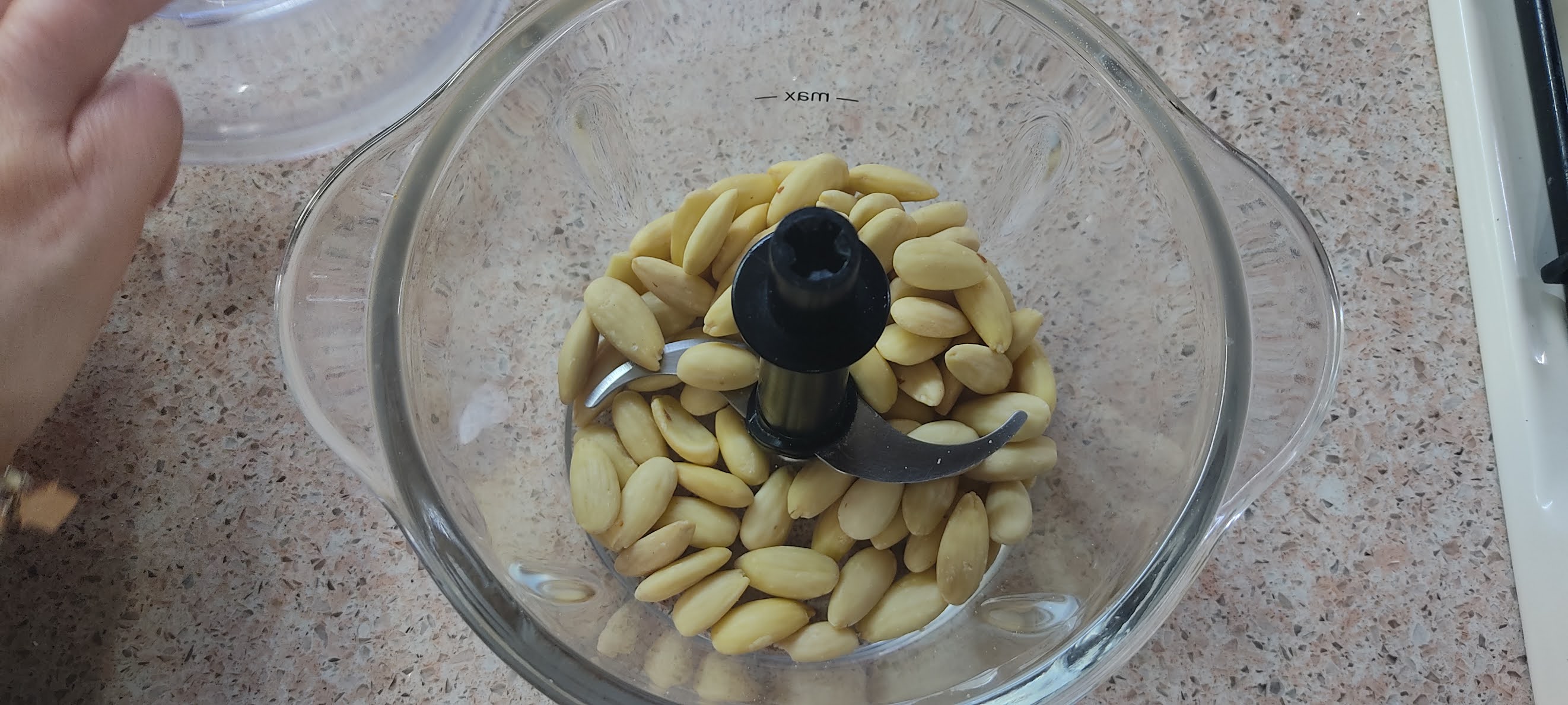 Tagliate a pezzetti il cioccolato fondente (f. 01) , ponetelo in una ciotola e fatelo sciogliere a bagnomaria (f.02), lo spesso farete col burro in un’altra ciotola (f.03) , lasciate raffreddare. Tritate col mixer le mandorle pelate, senza ottenere una grana molto fine. (f.04).