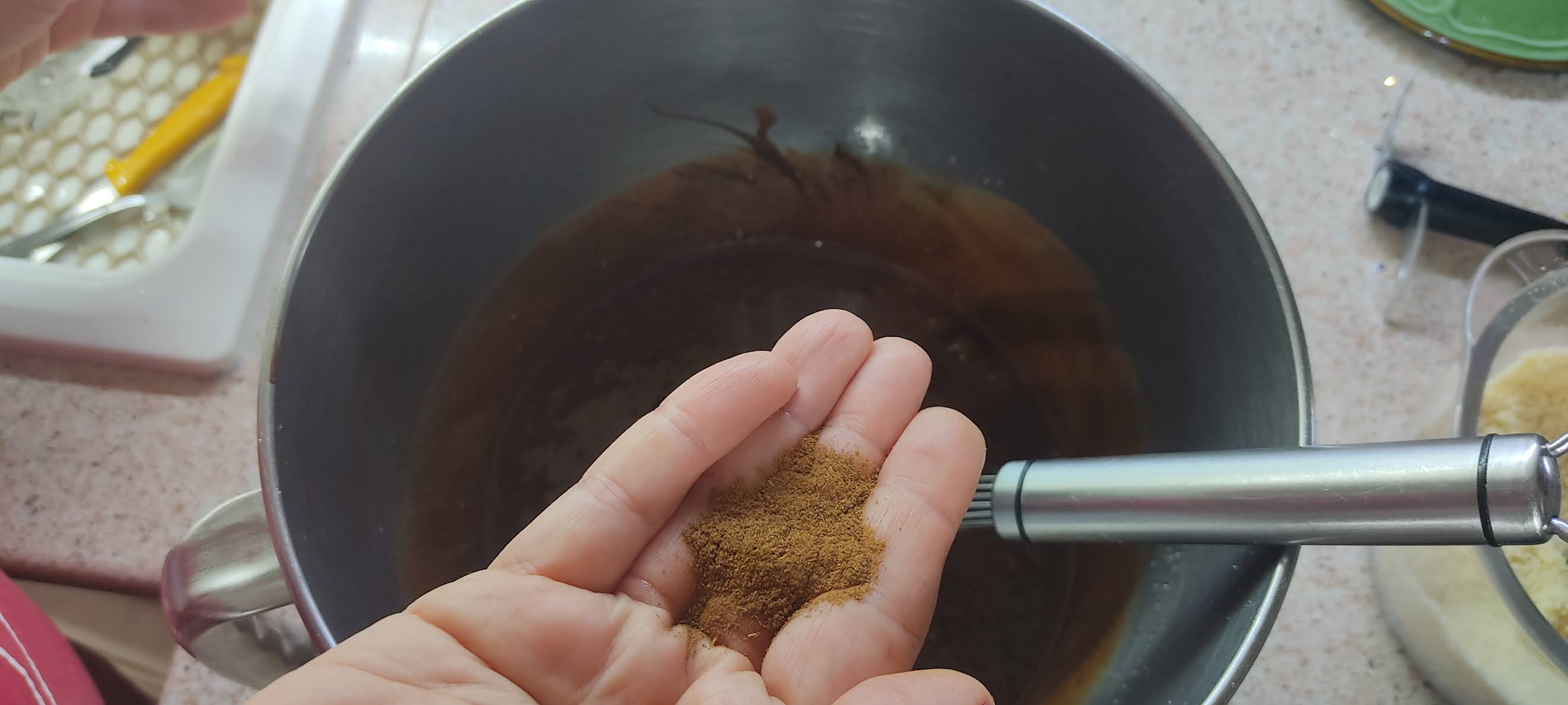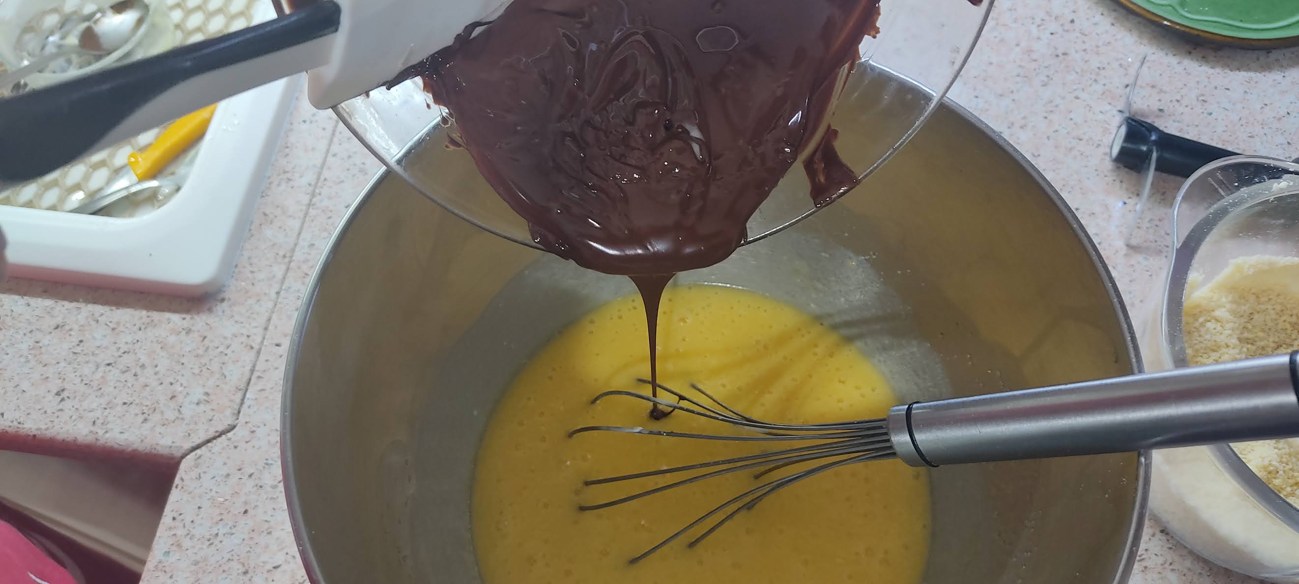 In una ciotola unite le uova intere allo zucchero e mescolate con una frusta senza montare, fin quando lo zucchero si sarà sciolto.(f.05) Aggiungete il sale (f.06). Unite il cioccolato fuso (f.07) ed il burro (f.08) al composto, continuando a mescolare. Infine aggiungete la farina di mandorle, le mandorle tritate (f.09) e la cannella (f.10).