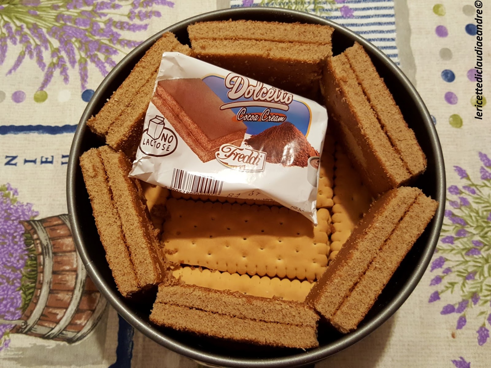 - Tagliare due strati di biscotti della misura di uno stampo tondo con diametro 16 cm.