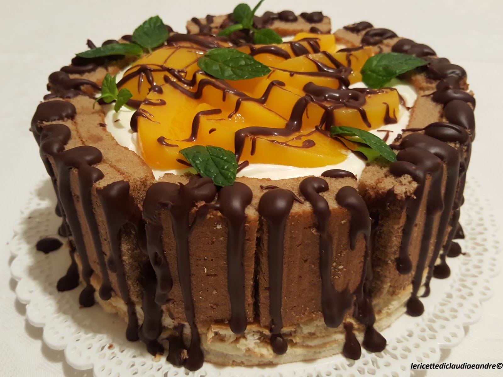 - Decorare la torta a piacere con il cioccolato fuso e con foglioline di menta.