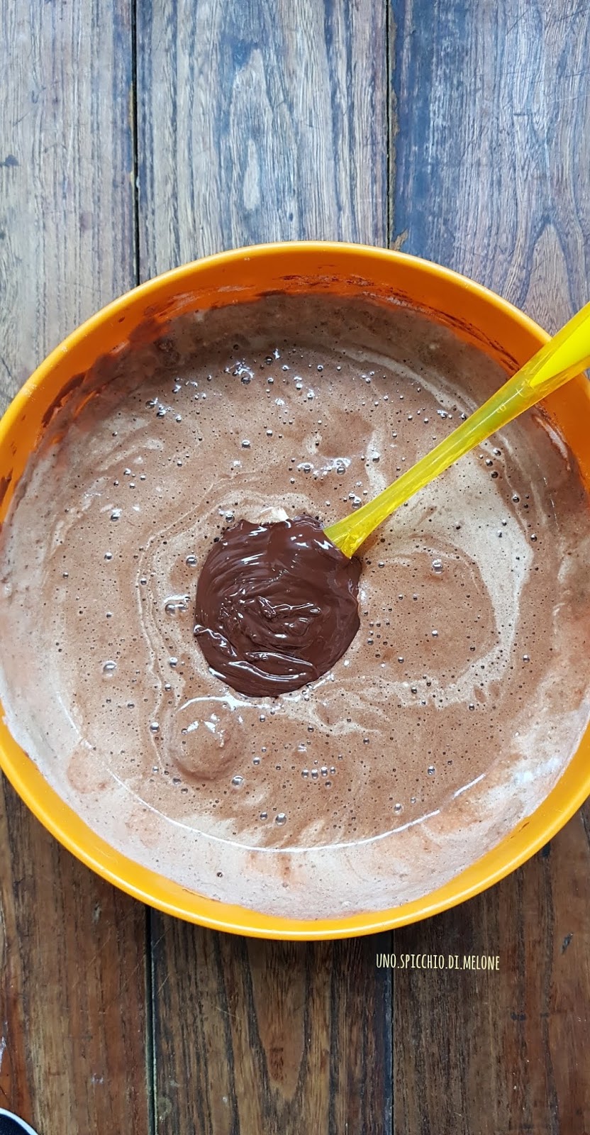 Riprendete la bowl ed aggiungete gradatamente questi due ultimi ingredienti: il cioccolato fuso (tiepido) e gli albumi montati a neve.
