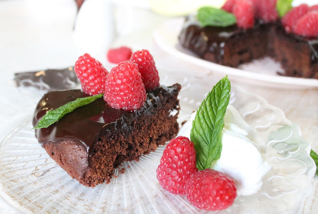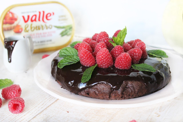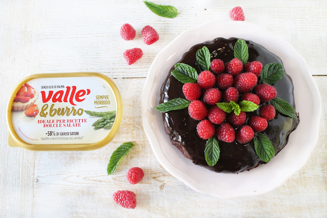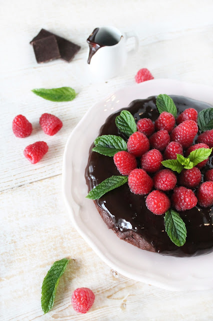 Una volta che la torta è tiepida glassare con la restante crema di burro e cioccolato. Riporre in frigorifero per una mezz’oretta e poi decorare con i rimanenti lamponi e foglioline di menta.