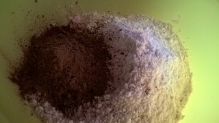 Adesso miscelate 130 g di farina 00, 70 g di cocco disidratato, 30 g di cacao amaro e 50 g di farina di carrube (se non riuscite a trovarla raddoppiate il peso del cacao).