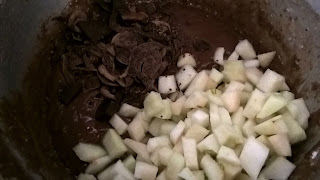 Unite all’impasto due pere tagliate a piccoli cubettti e 50 g di cioccolato fondente spezzettato.