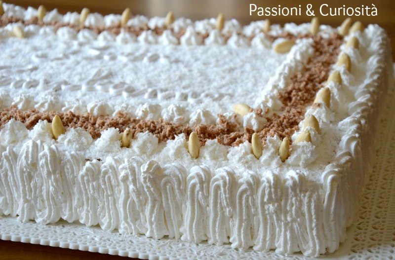 Stendere su tutta torta un leggero strato di panna,anche sul bordo, poi decorare a piacere con ciuffi di panna, mandorle intere, cocco e wafer sbriciolati.