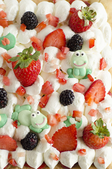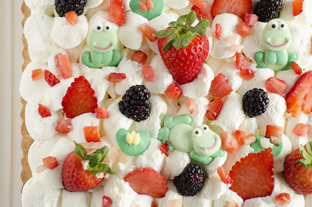 Montate la panna con lo zucchero e la vaniglia. Con la sac à poche decorate la torta a ciuffetti e decoratela con frutta colorata e sagome di zucchero.