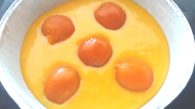 Versare l’impasto per meta’ in una teglia antiaderente infilare le mezze albicocche e coprire con