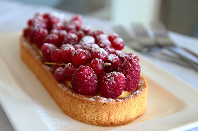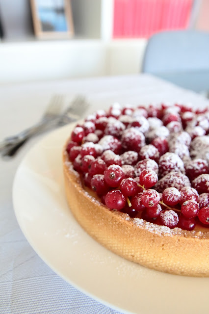 Una volta raffreddato il guscio di pasta, riempitelo con la crema tiepida e fatelo riposare in frigorifero. Io prima di servirla l’ho ricoperta di lamponi e ribes, mentre la ricetta prevedeva di utilizzare dei limoni canditi. Lasciate riposare in frigo fino a poco prima di servirla.