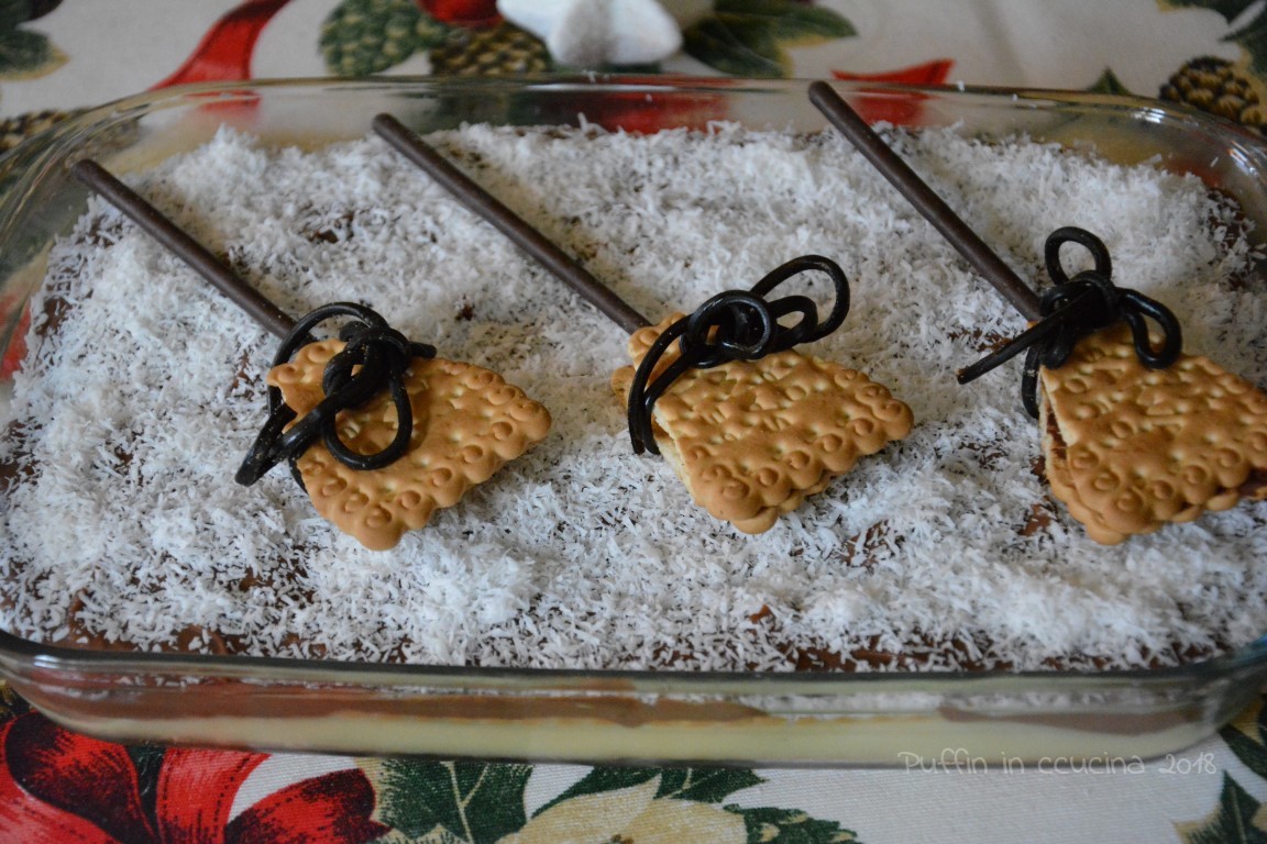 Stamani abbiamo decorato il dolce con farina di cocco e scopette delle Befana preparate semplicemente con i biscotti secchi, Nutella e Mikado, il tutto legato con liquirizia ^_^