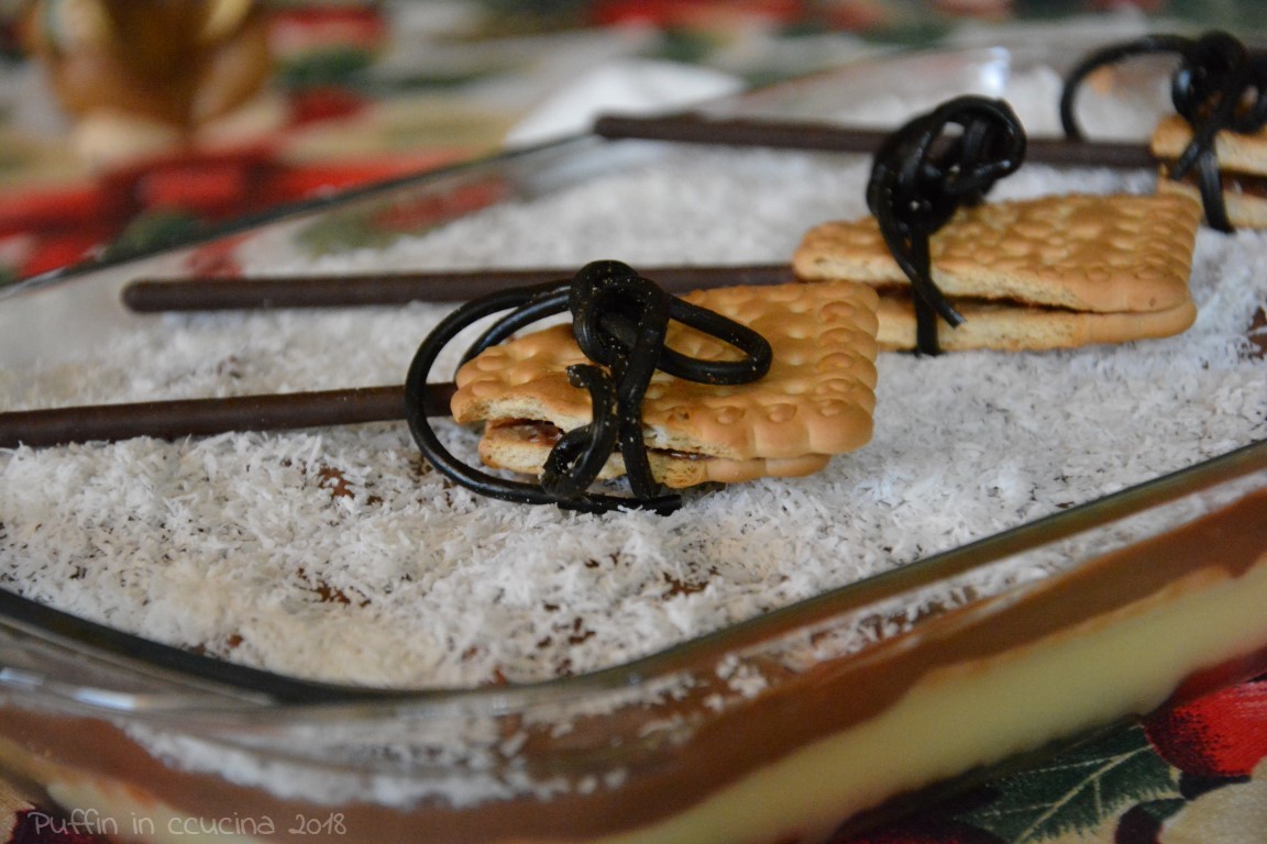 In questi giorni di vacanza io e le mie due birbanti abbiamo anche cucinato e ieri ci siamo cimentate nella torta con gallette e budino vaniglia e cioccolato che abbiamo finito di decorare stamattina e abbiamo mangiato tutti insieme da nonna.