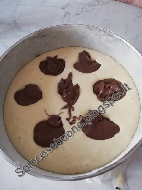 Livelliamo bene il composto e versiamo le cucchiaiate di nutella sulla superficie.