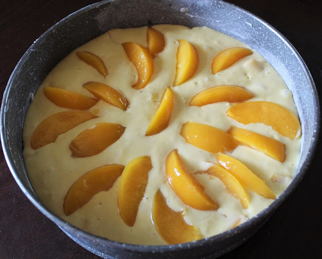 Imburrare ed infarinare uno stampo con il bordo apribile da ventiquattro centimetri, versarvi l’impasto e disporre le fettine di pesca a raggiera.