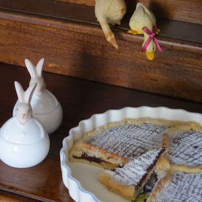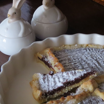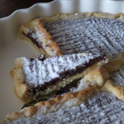 Una pasta arricchita con farina di mandorle e amaretti che donano alla torta un profumo particolare e una farcia al cioccolato, che io ho scelto fondente, ma che è ugualmente ottima con il cioccolato bianco.