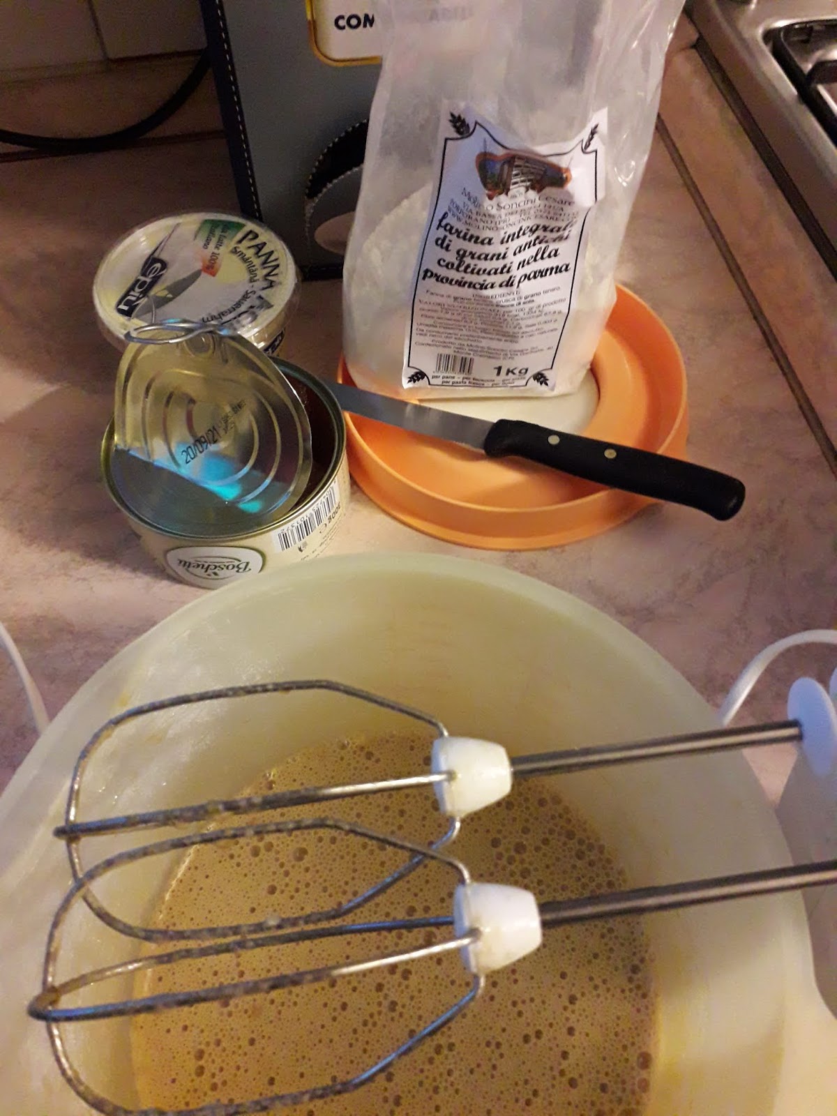 In una ciotola lavorare zucchero e uova,aggiungere panna ,latte ed infine la farina setacciata