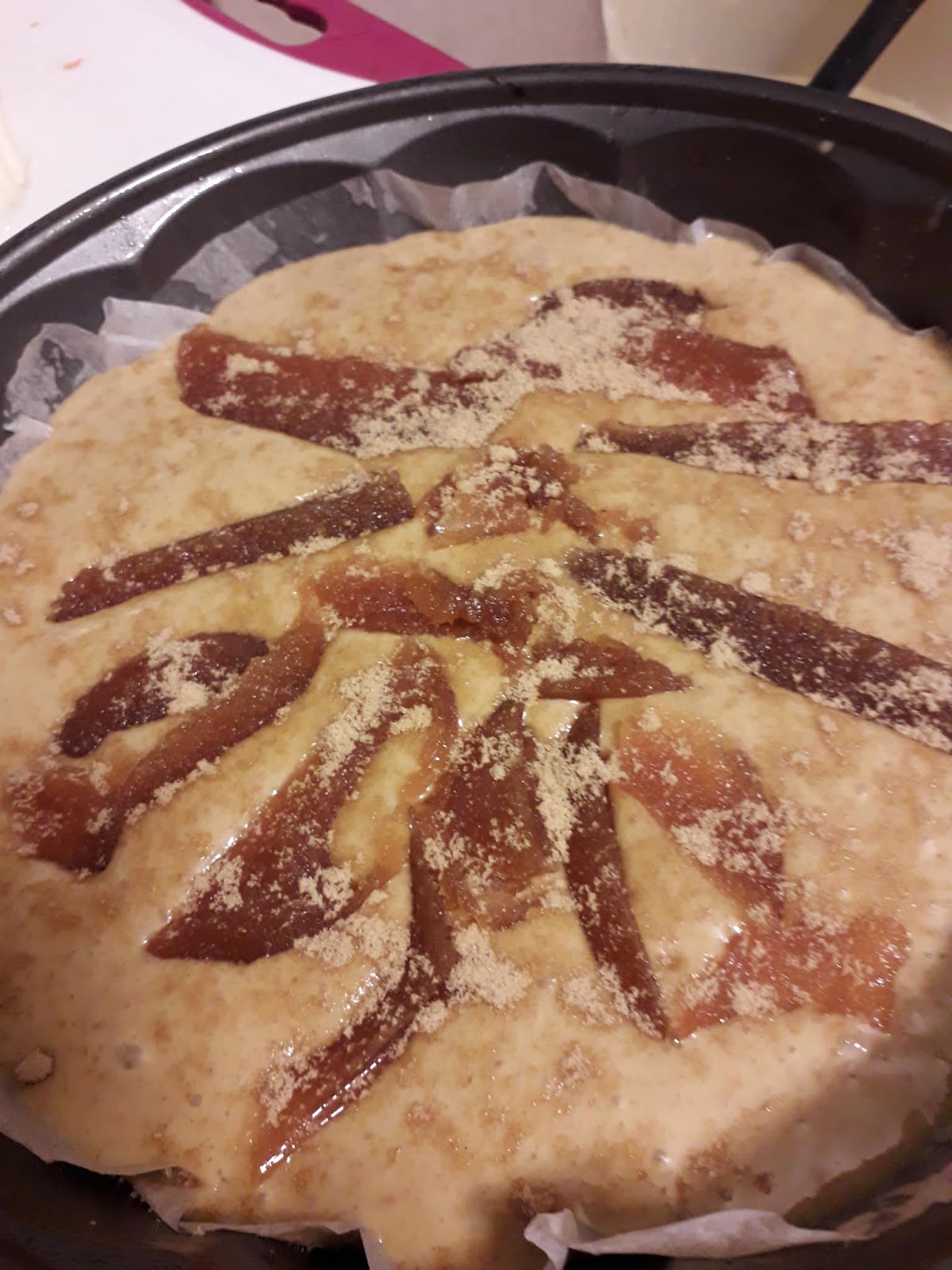 da carta forno , infilare nell’impasto la confettura di mele cotogne tagliata a fette e spolverare