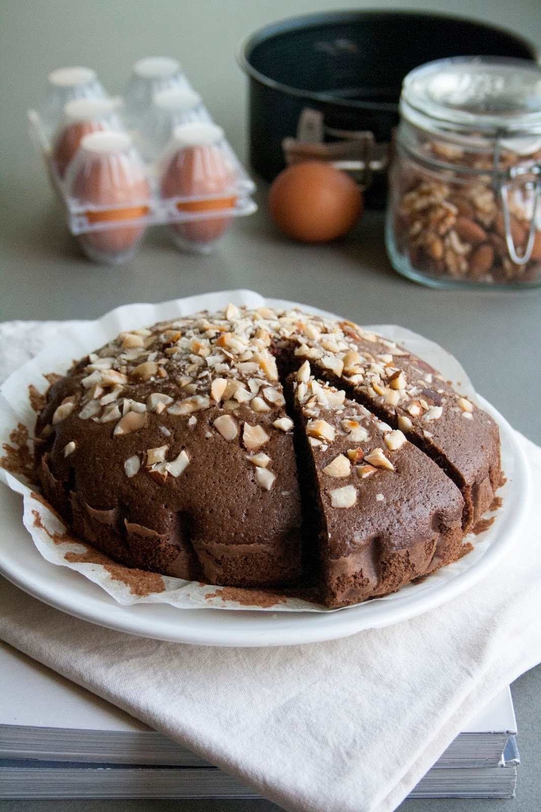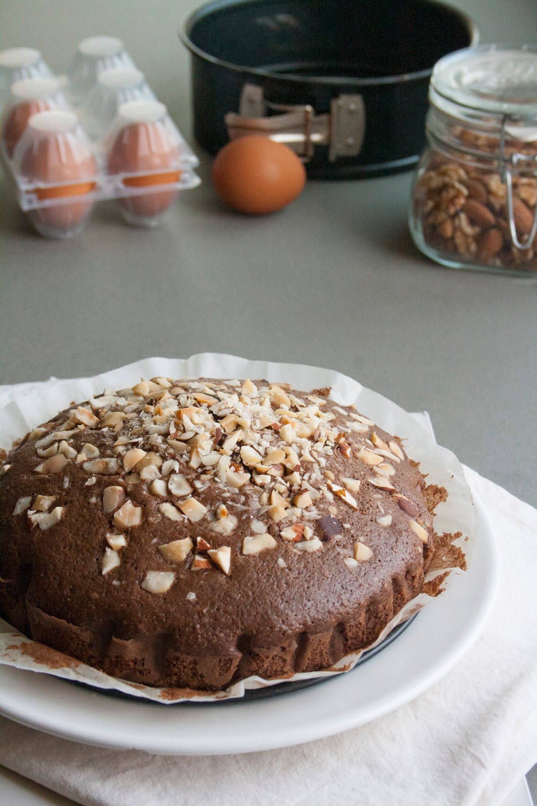 Aggiungere metà noci nell’impasto, mescolare ancora, versare la miscela nello stampo imburrato e infarinato, e poi cospargere le restanti noci e una manciata di zucchero.