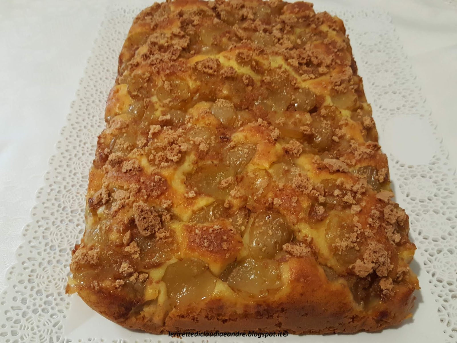 - Rovesciare dentro la miscela ottenuta, livellare, distribuire sopra l’uva e gli amaretti sbriciolati con le mani.