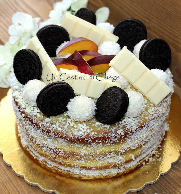 Prima di servirla decoratela con cioccolato bianco, fettine di pesche noci, raffaello e biscotti oreo.