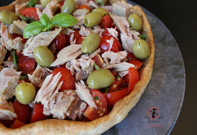 Al momento di andare in tavola versate l’insalata di pomodori all’interno del vostro guscio di pasta, spezzettate il tonno con le dita e fatelo cadere sulla superficie insieme alle olive.