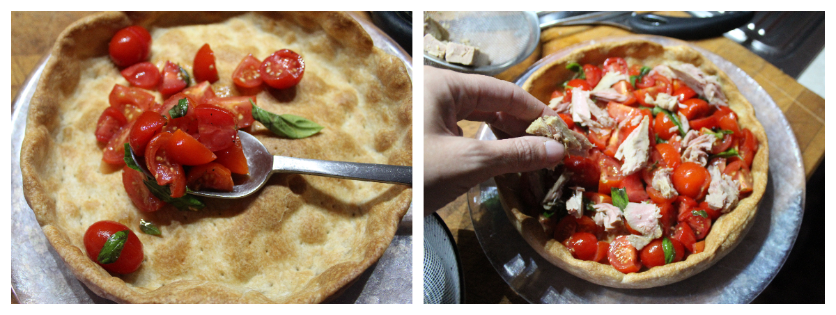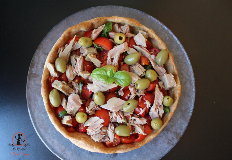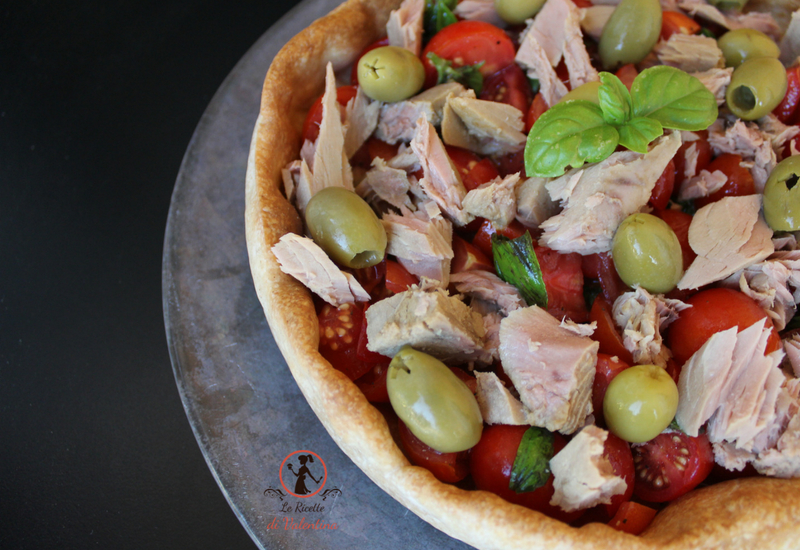 Al momento di andare in tavola versate l’insalata di pomodori all’interno del vostro guscio di pasta, spezzettate il tonno con le dita e fatelo cadere sulla superficie insieme alle olive.
