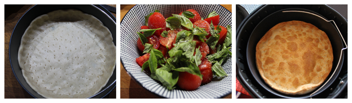 Stendete la pasta all’olio e in uno strato sottile direttamente nella teglia della friggitrice Master a schiacciarla con le dita per ricoprire tutta la teglia creando un bordo alto circa due dita abbondanti. Con una forchetta forate il fondo e Cuocete 10 minuti a 180°.