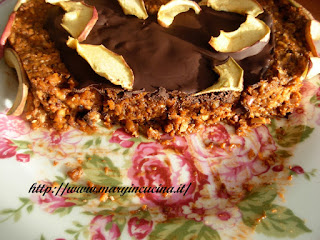 Frullare tutti gli ingredienti e versare l’impasto in una tortiera o una forma di acciaio, livellarlo e tenere in frigo un paio d’ore per farlo indurire. Sciogliere a bagnomaria il cioccolato. Sformare il dolce e decorarlo con il cioccolato fuso e le mele essiccate.