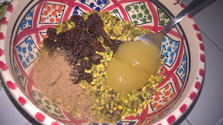 Ho preparato un ripieno con 50 g di pistacchio di Bronte in granella (potete sostituirlo con mandorle, noci o nocciole), un cucchiaio di miele, cannella, un cucchiaio di uvetta. Ho impastato e ho farcito l’interno delle mele.