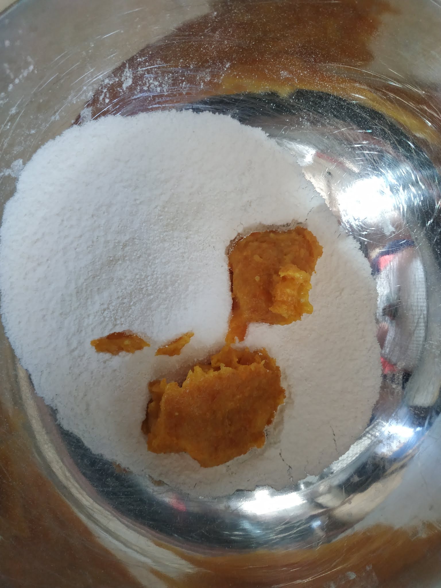 Montare in planetaria o con le fruste gli albumi con il pizzico di sale; quando saranno a neve ferma, aggiungere il cremor tartaro. Aggiungete piano piano lo zucchero; setacciate la farina e aggiungetela gradatamente all’impasto; unite anche il composto d’arancia e la vaniglia.