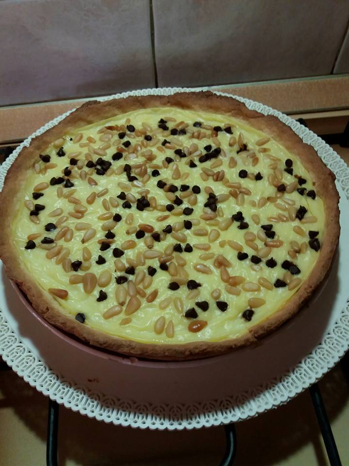 Procedimento : Mettere il latte a scaldare in un pentolino. In un altro mettere l’uovo con lo zucchero e lavorarlo bene, aggiungere gli amidi. Incorporare a filo il latte caldo. Mettere il pentolino sul fuoco e sempre mescolando raggiungere il bollore. Quando la crema si sarà ben addensata toglierla dal fuoco e farla raffreddare mettendo un foglio di carta trasparente per alimenti a contatto con la crema. Nel frattempo che la crema raffreddi ,preparare la frolla. In una ciotola mettere il burro ammorbidito a temperatura ambiente e lo zucchero, amalgamare bene. Aggiungere la buccia grattugiata di un limone ,mettere le uova e lavorare bene. Incorporare poco alla volta la farina e il lievito , lavorare bene tutti gli ingredienti. Formare un panetto e metterlo a riposare per circa 30 minuti in frigo. Riprendere il panetto di frolla e stenderla su di un foglio di carta da forno e dargli la forma per metterla nella tortiera. Bucherellare la frolla con una forchetta, adagiarci la crema su tutta la superficie, mettere i pinoli e se lo desiderare anche le gocce di cioccolato. Infornare in forno già caldo per circa 25/30 minuti a 180° C……… Buon Appetito!!!!!!!!.