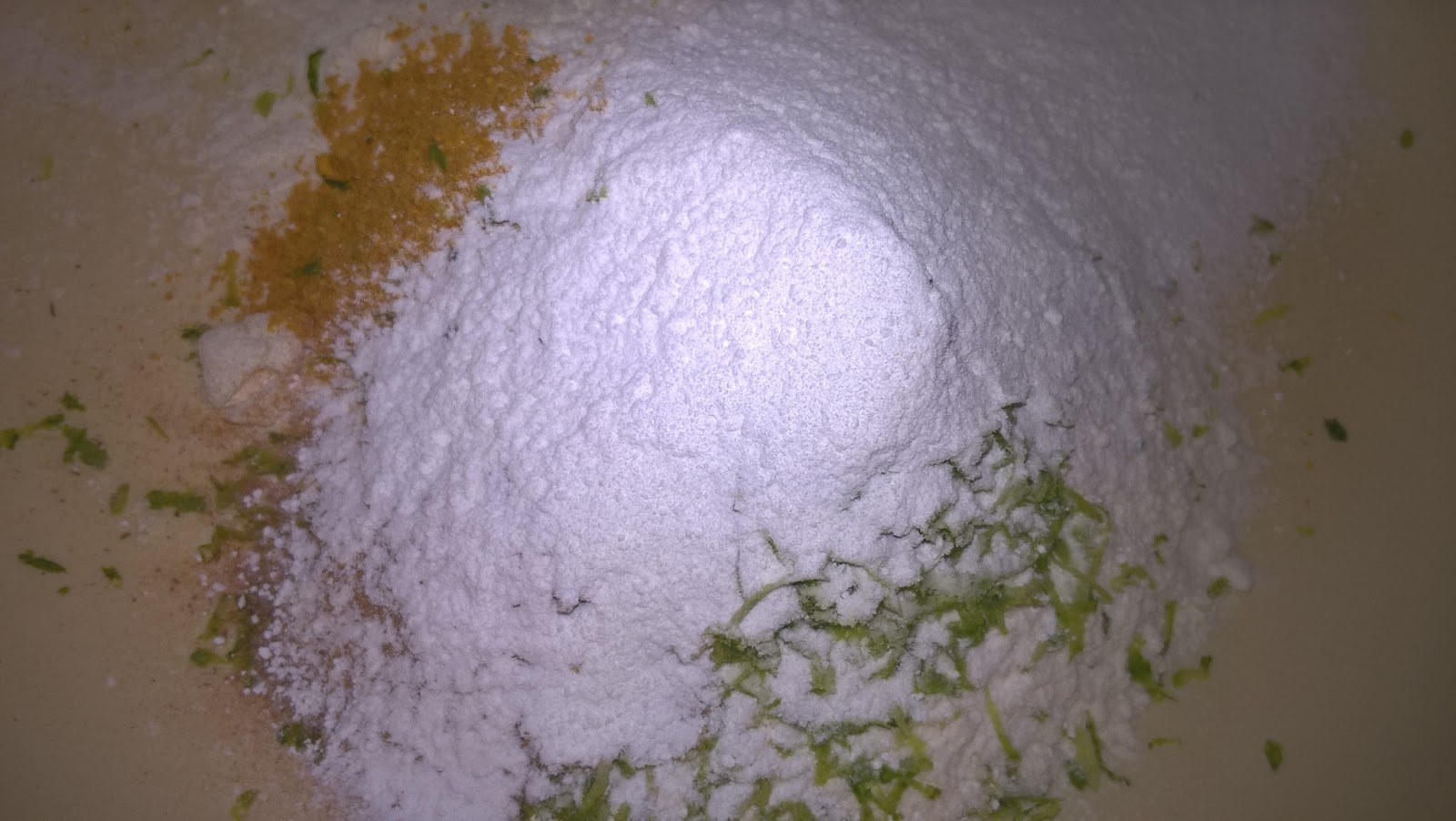 Ora è il turno delle polveri: 70 g di farina 00, 1 bustina di lievito, buccia grattugiata di un limone, polvere d’arancia o buccia grattugiata di una arancia.