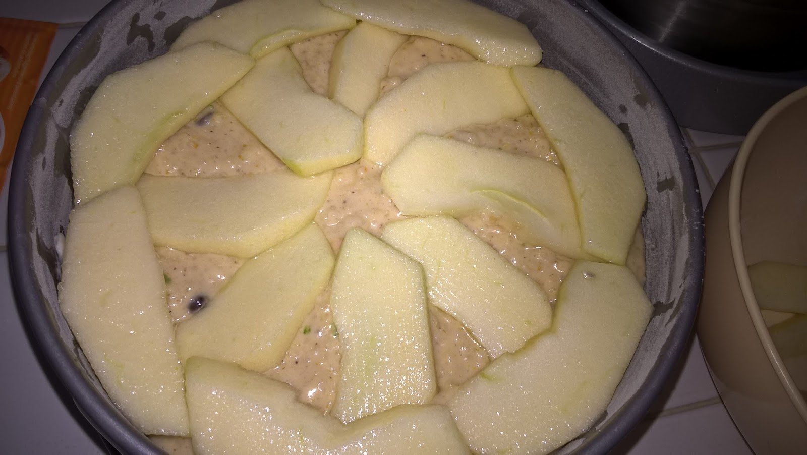 Sistemate l’impasto in una teglia imburrata e infarinata; sulla superficie sistemate delle fettine di mele che avrete cosparso di succo di limone e zucchero.