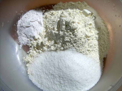 In un’ampia ciotola mettiamo la farina, lo zucchero e il lievito,