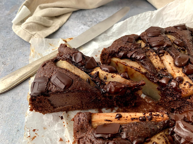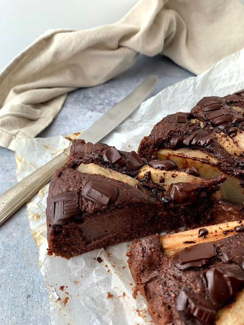 Versare il composto della torta in una teglia di circa 24 centimetri di diametro rivestita di carta forno. Decorare la superficie della torta con il cioccolato fondente a pezzettini e la pera sbucciata e tagliata a fettine. Infornare in forno già caldo a 170°C statico per circa 40 minuti (fare sempre la prova stecchino prima di togliere la torta dal forno). Una volta che la torta è tiepida potete metterla in un piatto di portata e servirla. Si mantiene per un paio di giorni a temperatura ambiente, ma se la conservate in frigorifero si mantiene anche per 4-5 giorni, basterà scaldarla leggermente prima di mangiarla e sarà come appena sfornata.
