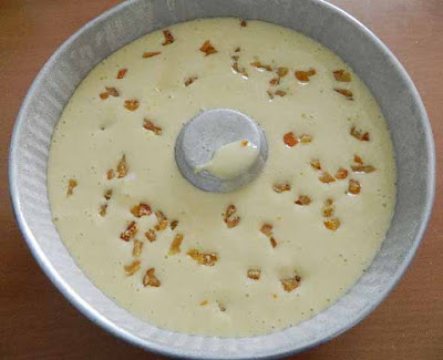 Versare il composto nello stampo precedentemente oliato e infarinato e cospargere la superficie con le scorzette di arancia