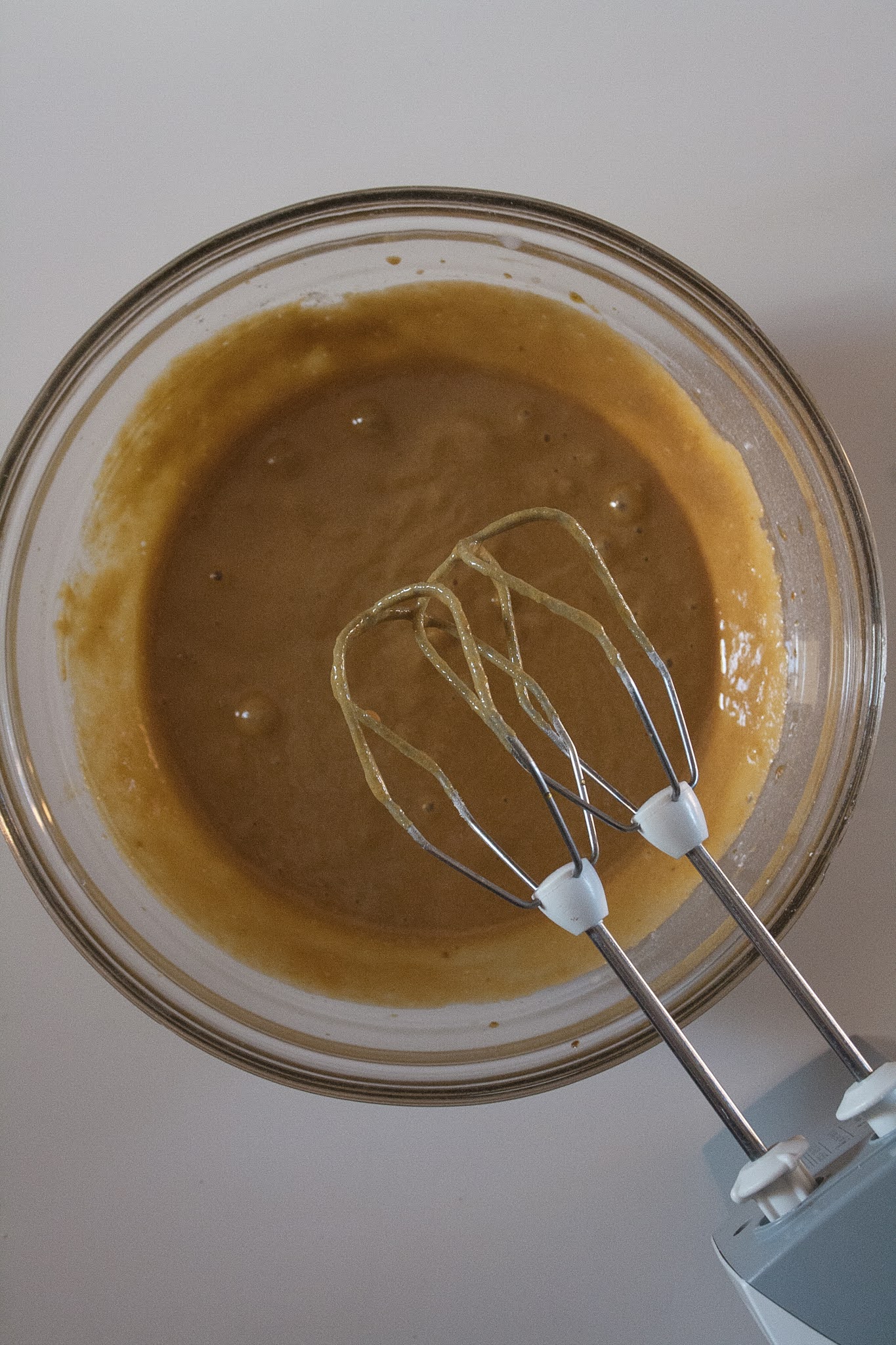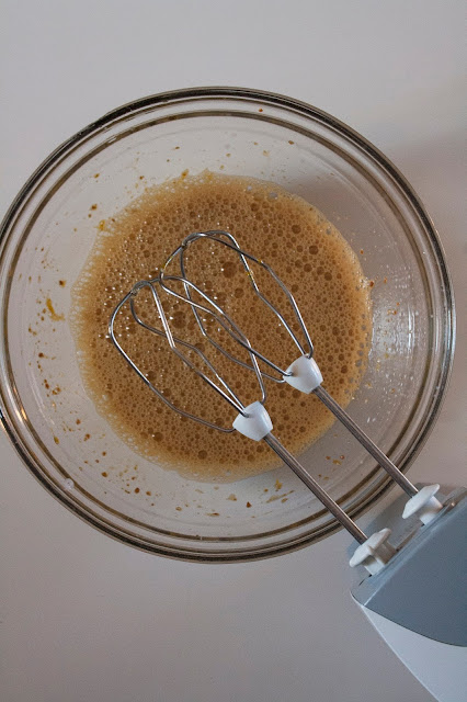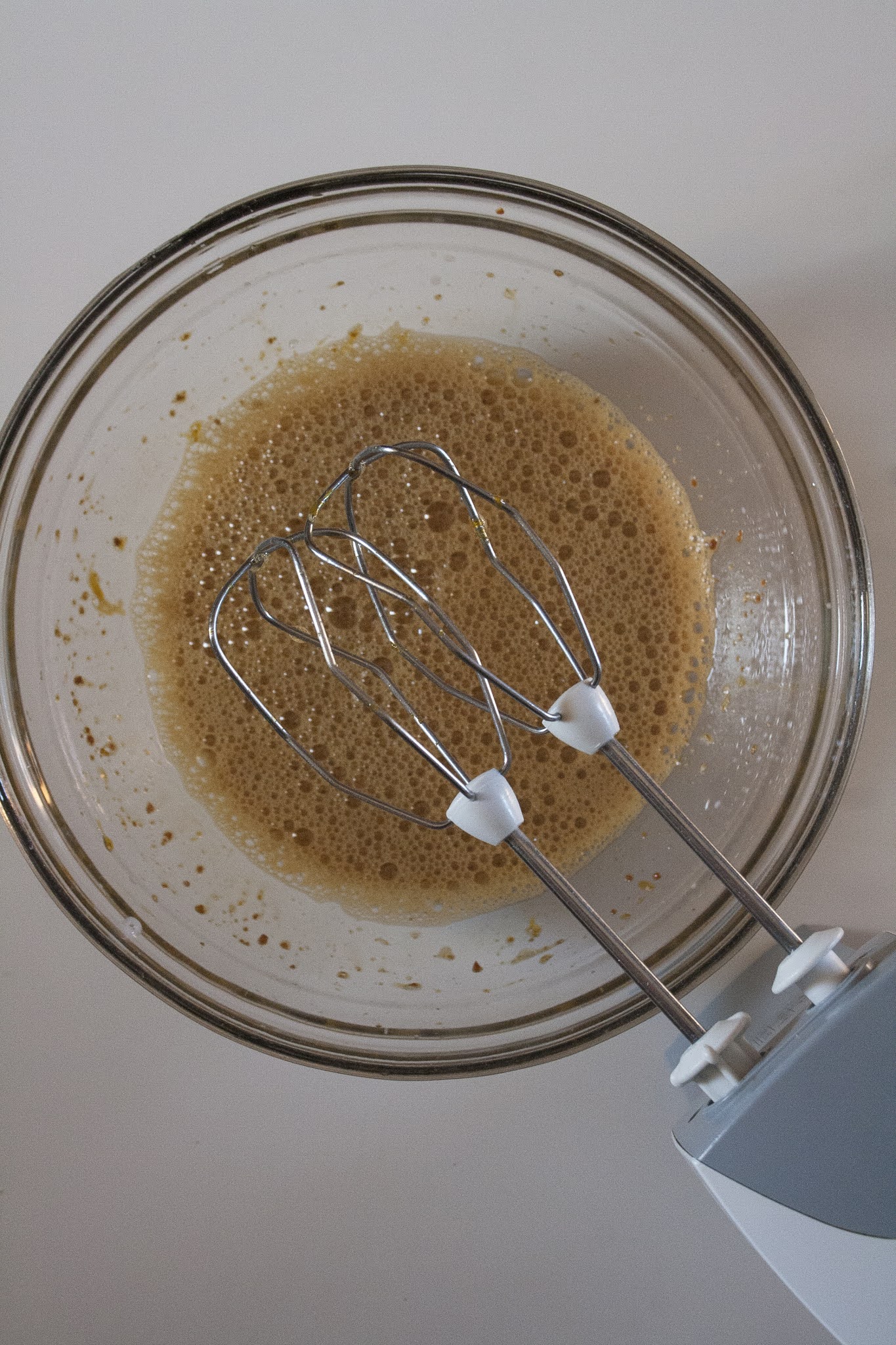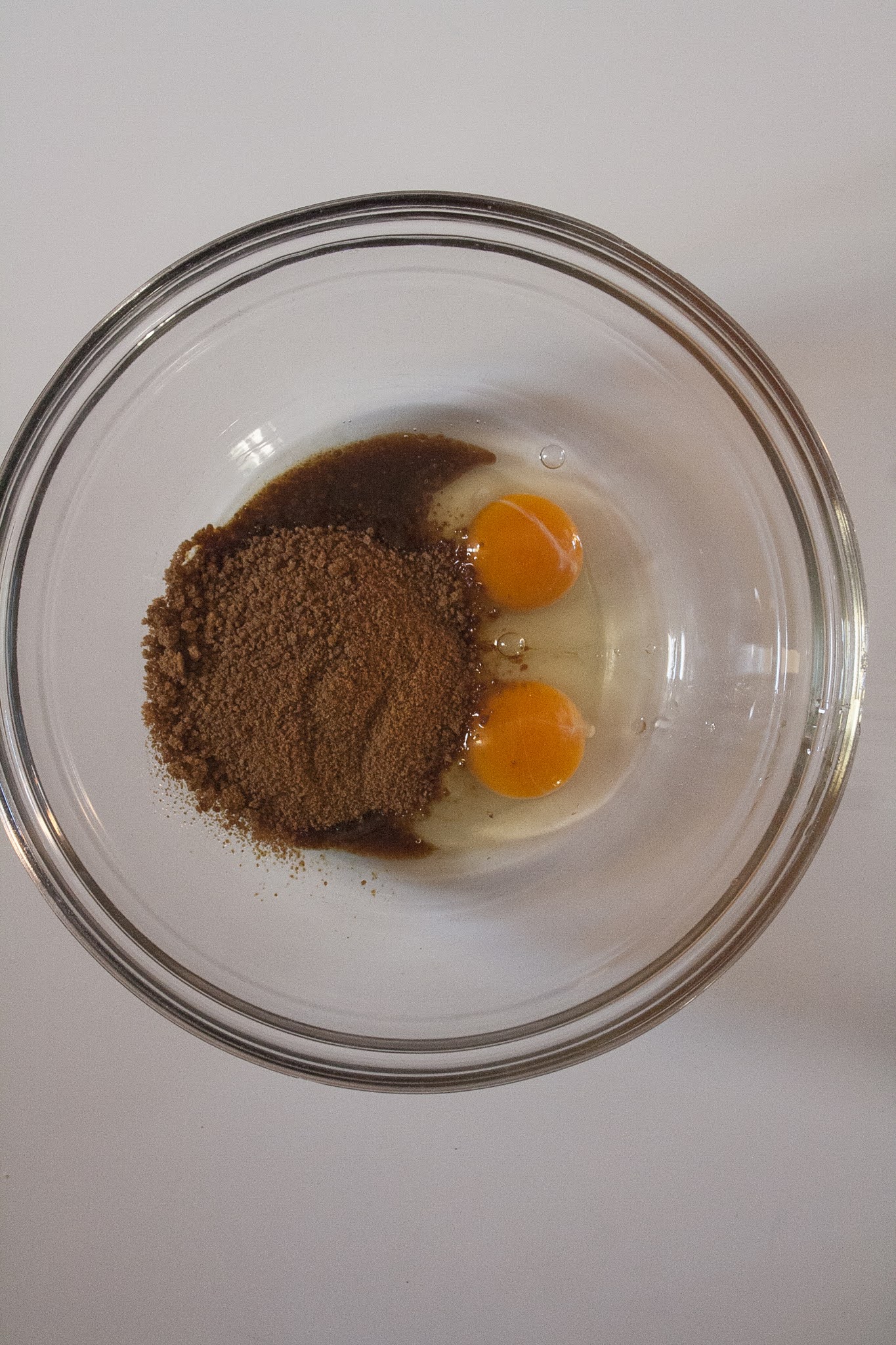 Poi proseguite la preparazione lavorando con lo sbattitore elettrico le 2 uova intere con lo zucchero di canna fino ad ottenere un composto spumoso.