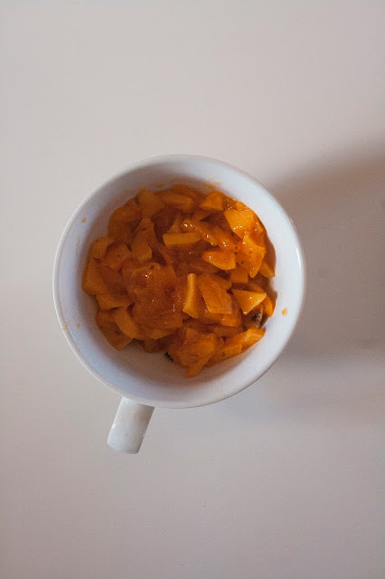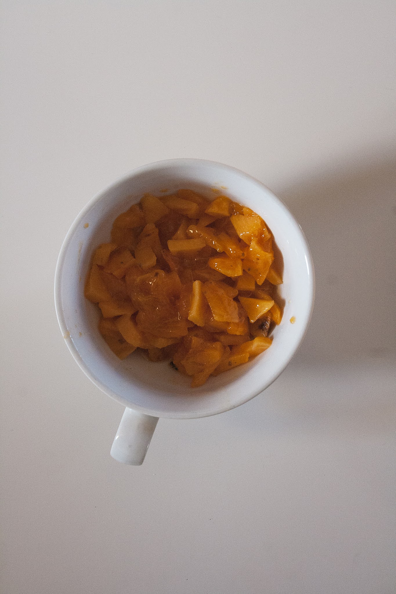 Sbucciate i 2 cachi, riducete a pezzettini la loro polpa e mettete da parte.